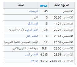 جدول (3) أهم مراحل التطور البشري على مقياس السنة الكونية (ويكيبيديا).