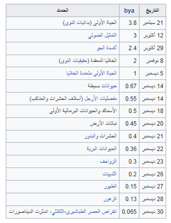 جدول (2): أهم مراحل تدرج عمارة الأرض بالحياة على مقياس السنة الكونية (ويكيبيديا).