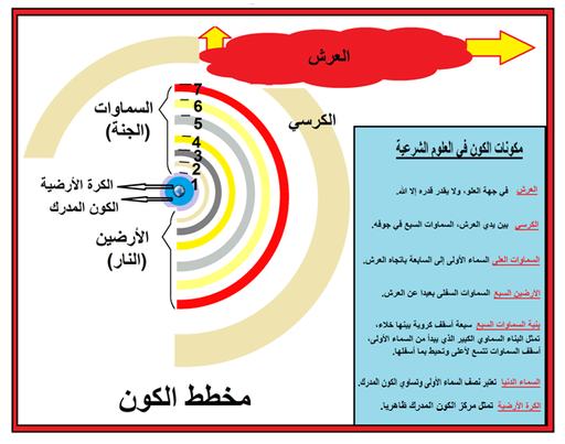 شكل رقم (1): مخطط مقترح للكون بمعناه الواسع في العلوم الشرعية، مع وصف موجز لمكونات الكون.
