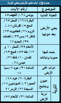 - اللمسة القرآنية الحانية على البشر الضعفاء من حيث نعمة خلق النباتات، وإحياء الأرض (التربة) بعد موتها وربط ذلك بإحياء القلوب بالقرآن (جدول 5).