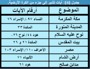 - الأرض بمعنى الموقع أو أي جزء من الكرة الأرضية وقعت عليه بعض الأحداث التاريخية (مثل مكة المكرمة والمدينة المنورة وغيرهما، جدول 6).