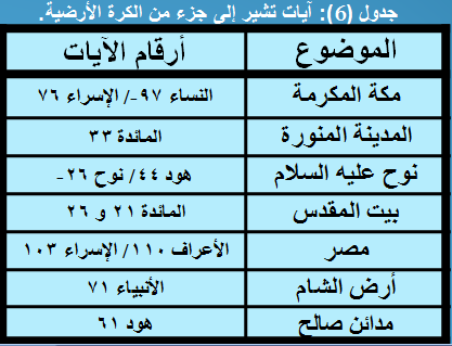 تتناول بعض الآيات أحداثا تاريخية وقعت على الأرض أو الكرة الأرضية مثل الآيات المذكورة في جدول (6)، ومن المؤكد أن كل حدث من هذه الأحداث وقع على نقطة محددة من الكرة الأرضية، لكن القرآن الكريم يشير إلى ذلك بكلمة (الأرض) مثل الأمثلة التالية: