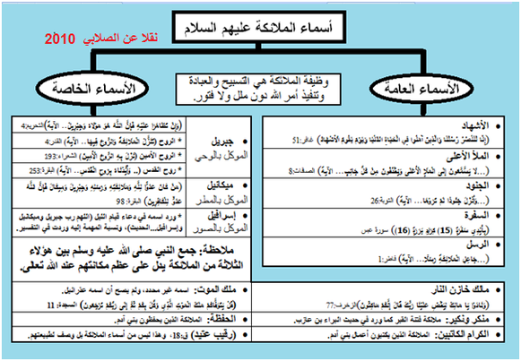 وقد قدم الصلابي (2010) عرضا موجزا لأسماء الملائكة الكرام مع تصنيف هذه الأسماء إلى أسماء عامة تشمل جميع الملائكة بأوصاف عامة، وإلى أسماء خاصة تشمل رؤوس الملائكة المكرمين وتشير إلى أهم وظائفهم عليهم جميعا السلام، وقد قام كاتب هذه السطور بتلخيص ما عرضه الشيخ الصلابي من أسماء للملائكة الكرام على صورة المقال الرئيسية أعلاه.