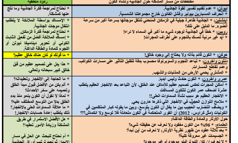 يعرض الجدول رقم (1) مقتطفات من أقوال العلماء المذكورة أعلاه حول قضية الجاذبية والأمور المرتبطة بها، كما يتضمن الجدول تعليق الباحث حول المدخل الإيماني للسير في طريق الحل لقضية الجاذبية ونشأة الكون، ويرى الباحث أنه على الرغم من هذا الكم الهائل من النظام والدقة في الكون من حولنا فإن العلماء الماديين المعاصرين يرفضون نسبة ذلك النظام إلى الخالق العظيم، لكن أوائل العلماء رواد العلم الحديث في بدايات عصر النهضة الأوروبية مثل كيبلر وغاليليو فقد أشاروا إلى التدخل الإلهي في كل الكون. وكذلك قال نيوتن: “النظام الرائع للشموس والكواكب والمذنبات يمكن أن يشير إلى سلطة عليا لكائن قدير وعبقري.. وهو يحكمها كلها ليس كروح بل كسيد مالك لكل الأشياء وبسبب سلطته العليا الغالبة فهو يدعى بالسيد الإله القدير”.