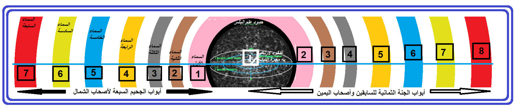شكل رقم (2): تصور مقترح لموقع أبواب الجنة وأبواب النار على مفهوم الكون.