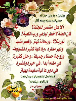 جاء في مختصر تفسير ابن كثير حول قوله تعالى من سورة التوبة: (وَعَدَ اللَّهُ الْمُؤْمِنِينَ وَالْمُؤْمِنَاتِ جَنَّاتٍ تَجْرِي مِنْ تَحْتِهَا الْأَنْهَارُ خَالِدِينَ فِيهَا وَمَسَاكِنَ طَيِّبَةً فِي جَنَّاتِ عَدْنٍ وَرِضْوَانٌ مِنَ اللَّهِ أَكْبَرُ ذَلِكَ هُوَ الْفَوْزُ الْعَظِيمُ (72))، روى ابن ماجة عن أسامة بن زيد رضي الله عنه قال: قال رسول الله صلى الله عليه وسلم: ((ألا هل من مشمر إلى الجنة؟ فإن الجنة لا حظر لها، هي ورب الكعبة نور يتلألأ، وريحانة تهتز، وقصر مشيد، ونهر مطرد، وثمرة نضيجة، وزوجة حسناء جميلة، وحلل كثيرة، ومقام في أبد في دار سليمة، وفاكهة وخضرة، وحبرة ونعمة، في محلة عالية بهية))، قالوا: نعم يا رسول الله نحن المشمرون لها، قال: ((قولوا: إن شاء الله))، فقال القوم: إن شاء الله..
