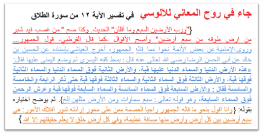 4) العثور على نص من كتب التفسير يتفق حرفيا مع نموذج السمان لبنية السماوات السبع والأرضين السبع، وللعثور على هذا النص قصة ذات دلالة: حيث أنه مع كل نص من نصوص التفسير المنقولة من كتاب الحناوي تم اختيار جملة مميزة لوضعها في شباك البحث، فإذا جاءت نتيجة البحث إيجابية ندخل إلى الروابط الواردة (أكثر من رابط) حتى نجد نفس النص ونتأكد من عدة روابط أن هذا النص من ذلك التفسير. وفي حالة النص المتوافق مع نموذج السمان كان الباحث يتسائل قبل العثور عليه بيومين ويدعو الله تبارك وتعالى أن يعطيه إشارة إلى أنه يسير في الطريق الصحيح، وكان هذا النص من تفسير الألوسي للآية 12 من سورة الطلاق (شكل 2)، حيث لم ينقل الحناوي سوى فقرتين من كلام الألوسي، لكن الباحث استكمل المطالعة على جوجل لما بعد الفقرات التي نقلها الحناوي فوجد ذلك النص الذي يقول عنه الألوسي أنه يوافق رأي الجمهور (شكل 2). فكانت هذه بشارة أن الباحث يسير على الطريق الصحيح (والله أعلم).