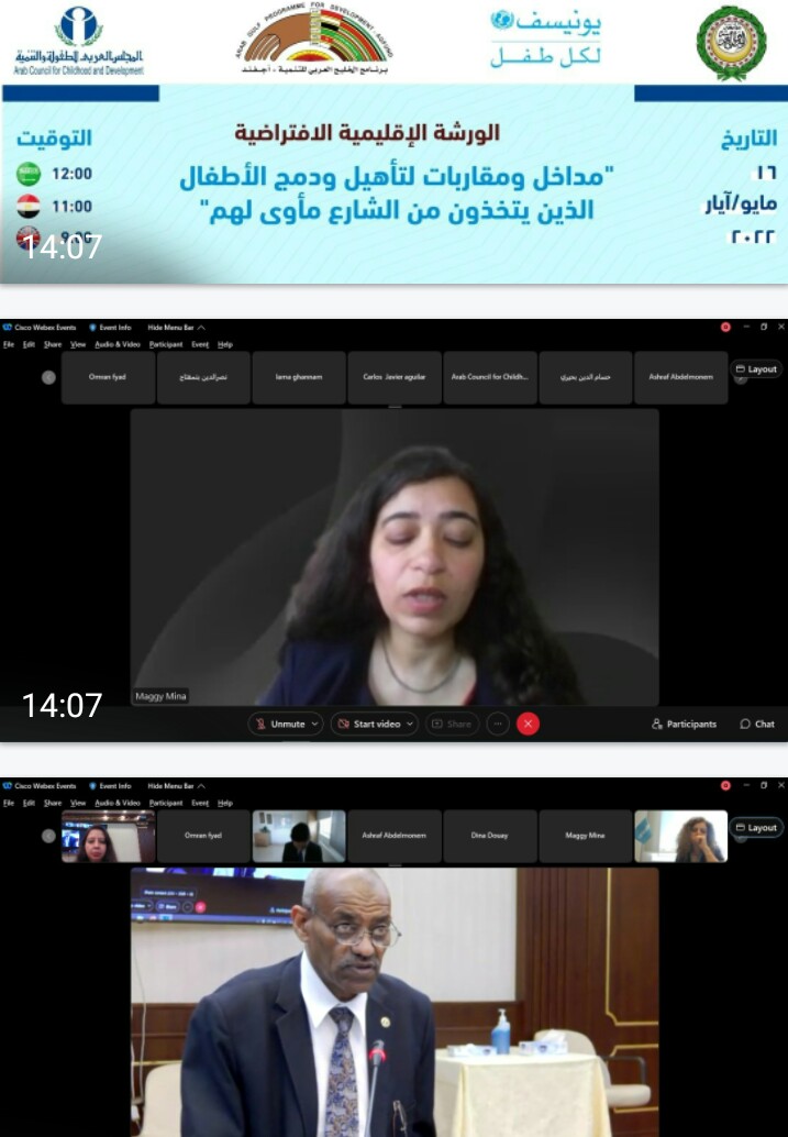 انطلقت صباح اليوم الإثنين 16 مايو /آيار 2022 أعمال ورشة العمل الإقليمية الافتراضية “مقاربات ومداخل في تأهيل ودمج الأطفال الذين يتخذون من الشارع مأوى لهم” بتنظيم من كل من جامعة الدول العربية/ إدارة المرأة والأسرة والطفولة والمجلس العربي للطفولة والتنمية وبرنامج الخليج العربي للتنمية “أجفند” واليونيسف الإقليمي، بمشاركة أكثر من 50 مشاركا يمثلون الآليات الوطنية للطفولة والمنظمات ذات العلاقة والخبراء والإعلام.