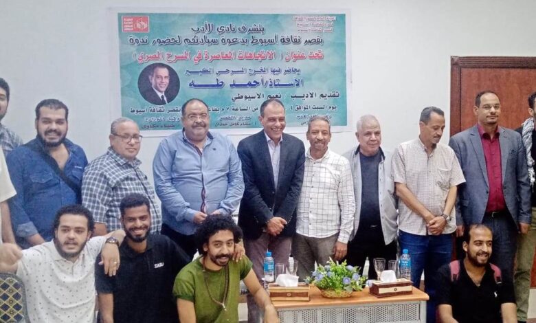 نظم قصر ثقافة أسيوط ملتقي ثقافي تحت عنوان  “الإتجاهات المعاصرة في المسرح المصري” ضمن فعاليات برنامج الإبداع الأدبي لنادي الأدب بقصر ثقافة أسيوط  برئاسة الأديب رأفت عزمى رئيس مجلس إدارة نادي الأدب .