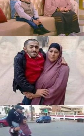 الأم زينب تحمل ابنها عبد المنعم الذي يعاني من مرض نادر على كتفها من الحضانة حتى الجامعة بصبر وإرادة
