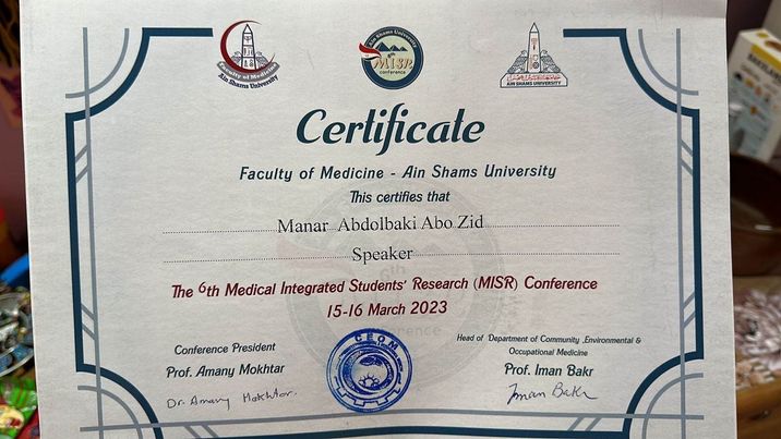 شاركت منار عبد الباقي أبو زيد الطالبة بكلية طب الأسنان جامعة MSA مع زملائها ملك محمد ومازن محمد في المؤتمر الطبي المتكامل السادس للأبحاث الطلابية بطب عين شمس.