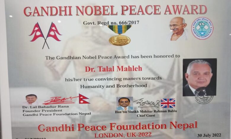 منح د طلال مشلح جائزة غاندي للسلام خلال مؤتمر السلام الذي عقد في لندن بحضور شخصيات عالمية وإعلامية مؤثرة في العالم