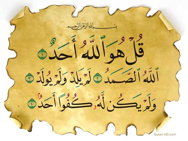 “قل هو الله أحد، الله الصمد، لم يلد ولم يولد، ولم يكن له كفوا أحد”