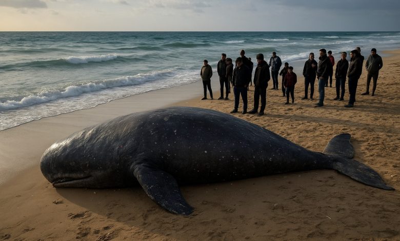 ظهر على شاطئ خان يونس جنوب قطاع غزة، في صباحٍ مشحونٍ بالرهبة والمفاجأة، مشهدٌ بدا كأنه خرج من فيلم خيالٍ علمي: جسد حوتٍ ضخمٍ، تجاوز طوله عشرة أمتار، وبلغ وزنه قرابة طنين، مكسوّ بقطراتٍ متلألئةٍ من ماء البحر، ملقى على الرمال الذهبية.