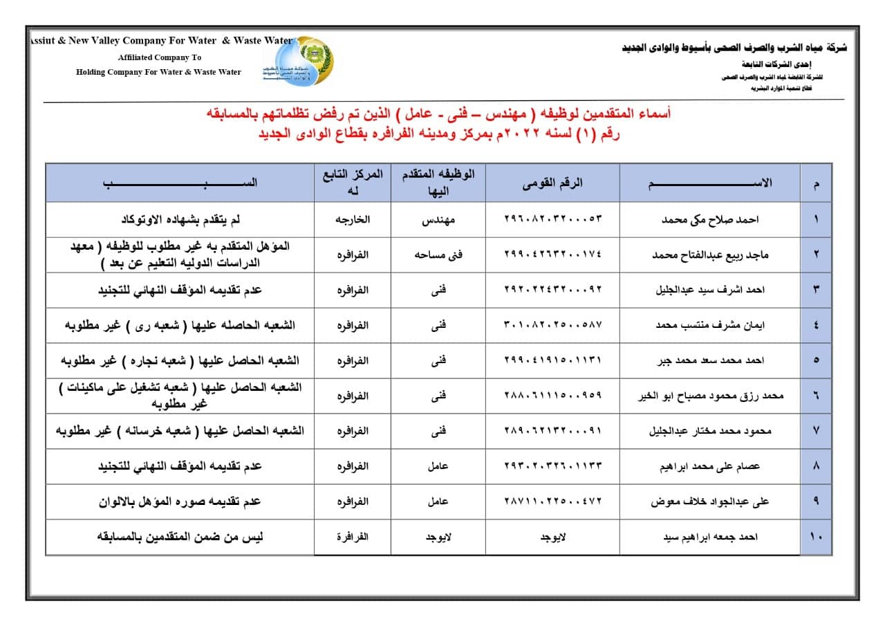 مياه أسيوط : أسماء المقبول تظلمهم بــوظائف مهندس وفنى وعامل بقطاع الوادي الجديد