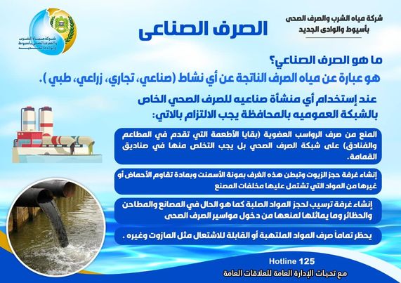 وأكد اللواء مهندس هشام درة رئيس مياه أسيوط، أن تفعيل إدارة الصرف الصناعي تأتي لمتابعة مدى مطابقة الصرف الناتج عن المنشاة الصناعية وفق المعايير المعمول بها بالقانون رقم 44 لسنة 2000، والتأكيد على أن تقنين وضع المنشأة الصناعية وضعها القانوني طبقاً لقرار رئيس الوزراء رقم 1012 لسنة 2018م حتى لا تتعرض المنشأة للمسائلة القانونية وتتحمل أعباء تنقية صرفها، ويتم إغلاق وصلة الصرف الصحي من قبل الجهات المعنية تجنباً لحدوث أخطار في البنية التحتية للمشروعات أو أي أضرار تلحق بشبكات الصرف الصحي من المخلفات الكيميائية والصناعية التي يتم صرفها على الشبكات من قبل المنشآت الصناعية غير مطابقة للحد المسموح به.