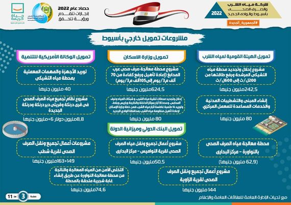 جدير بالذكر أن الشركة تمكنت من نهو الاستلام الابتدائي وتعزيز الأداء الخدمي بدخول الخدمة لعدد (7) محطات رفع صرف صحي منفذة من الهيئة القومية لمياه الشرب والصرف الصحي بمراكز الفتح والبداري والغنايم وأبنوب.