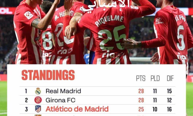 مازالت الصدارة مشتركة بين نادي العاصمة نادي ريال مدريد ونادي جيرونا برصيد ٢٨ نقطة ويآتي بعدهم نادي اتلتكوا مدريد ٢٥ نقطة وباقي له مباراة مؤجلة لو فاز به سيتساوي مع الريال وجيرونا