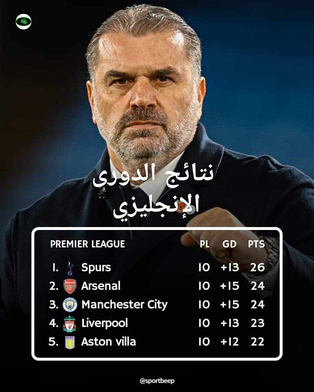 مازال المدرب الأسترالي لنادي توتنهام الإنجليزي انجي بوستيكوجلو متصدر بفارق نقطتين علي كل من الاسبانين مدربي نادي مان سيتي الانجليزي وارسنال الأول بيب جورديولا والثاني مايكل ارتيتا.
