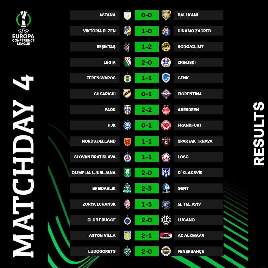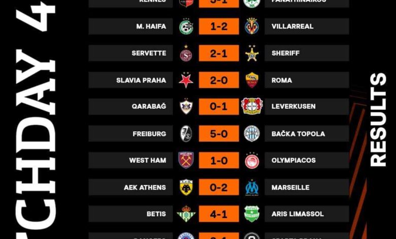 نتائج مباريات الجولة الرابعة لمنافسات المجموعة للدورى الأوربي ودورى المؤتمر