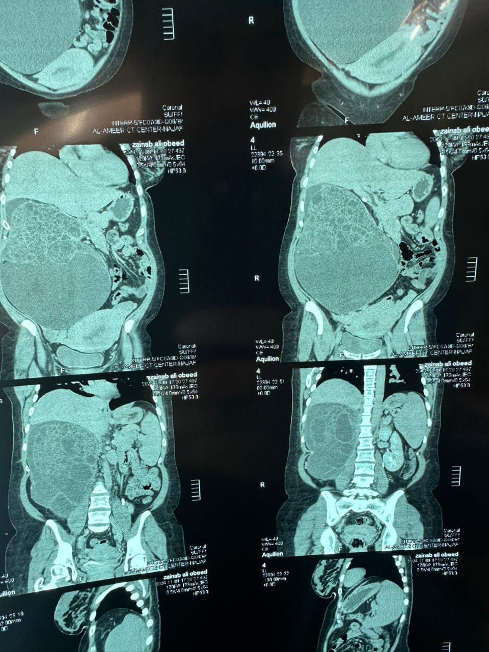 و بين الدليمي : بعد إجراء الفحوصات الشعاعيه و المختبريه ، تبين وجود ورم كبير في الكلية اليمنى ، يشغل معظم التجويف البطني للمريضه .