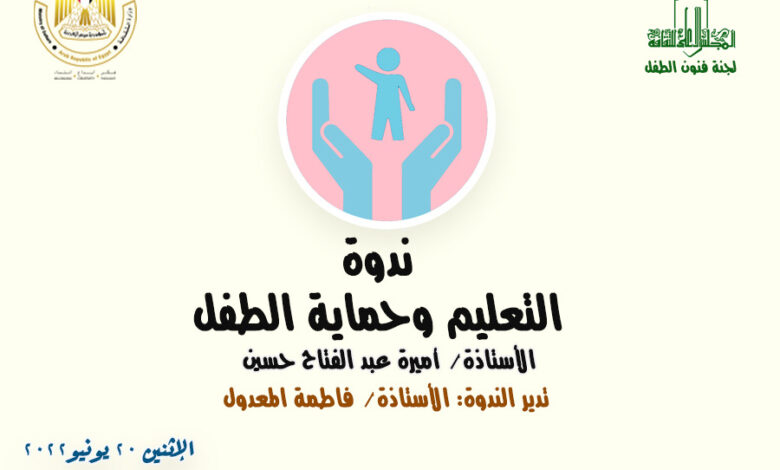 وزارة الثقافة، المجلس الأعلى للثقافة – لجنة فنون الطفل، تحت رعاية الأستاذة الدكتورة/ إيناس عبد الدايم – وزيرة الثقافة؛ يتشرف الأستاذ الدكتور/ هشام عزمي- الأمين العام للمجلس الأعلى للثقافة؛ و الأستاذة/ فاطمة المعدول- مقررة لجنة فنون الطفل بالمجلس الأعلى للثقافة، بدعوة حضراتكم لمتابعة وحضور ندوة ” التعليم وحماية الطفل “، وذلك في تمام الساعة الخامسة مساء يوم الإثنين 20 يونيو 2022 بقاعة الفنون بالمجلس الأعلى للثقافة.
