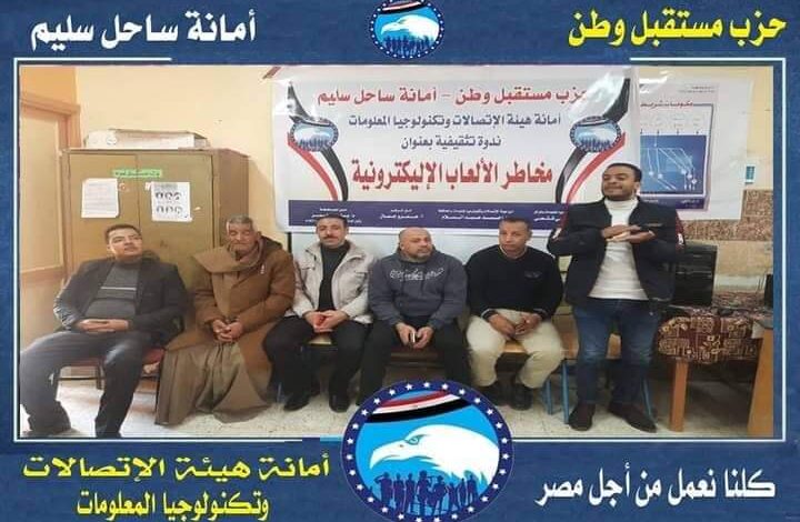 عقدت أمانة الإتصالات وتكنولوجيا المعلومات بحزب مستقبل وطن بمركز ساحل سليم ندوة تثقيفية بعنوان الإنتماء الوطنى والتصدى لحروب الجيل الخامس ومخاطر الألعاب الإلكترونية بمدرسة الإمام على بن أبى طالب بساحل سليم ،