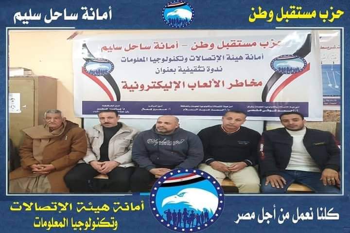 عقدت أمانة الإتصالات وتكنولوجيا المعلومات بحزب مستقبل وطن بمركز ساحل سليم ندوة تثقيفية بعنوان الإنتماء الوطنى والتصدى لحروب الجيل الخامس ومخاطر الألعاب الإلكترونية بمدرسة الإمام على بن أبى طالب بساحل سليم ،