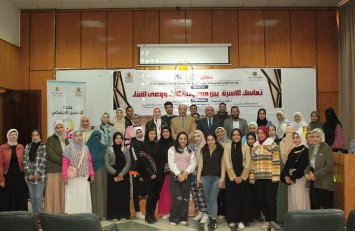 نظمت وحدة التضامن الاجتماعي بجامعة أسيوط اليوم السبت بالتعاون مع مركز رصد المشكلات المجتمعية بجامعةأسيوط ندوة توعوية تحت عنوان تماسك الأسرة بين مسئولية الآباء، ووعي الأبناء تحت رعاية الدكتورة نيفين القباج وزيرة التضامن الاجتماعي والدكتور أحمد المنشاوي رئيس جامعة أسيوط والدكتور أحمد عبد المولى نائب رئيس جامعة أسيوط لشئون التعليم والطلاب والدكتور صلاح هاشم مستشار وزير التضامن الاجتماعي للسياسات الاجتماعية ومنسق عام وحدات التضامن الاجتماعي بالجامعات المصرية وبحضور الدكتور محمود عبد العليم نائب رئيس جامعة أسيوط لشئون خدمة المجتمع وتنمية البيئة والدكتور علي كمال أستاذ بقسم المناهج وطرق التدريس بكلية التربية بجامعة أسيوط ومدير مركز رصد ودراسة المشكلات المجتمعية بجامعةأسيوط والدكتورة أسماء جابر أستاذ مساعد بقسم علم الاجتماع بكلية الآداب بجامعة أسيوط ونائب مدير مركز رصد المشكلات المجتمعية بجامعة أسيوط وأحمد المنصوري منسق وحدة التضامن الاجتماعي بجامعةأسيوط وعدد من أعضاء هيئة التدريس ومعاونيهم والعاملين والطلاب بجامعة أسيوط