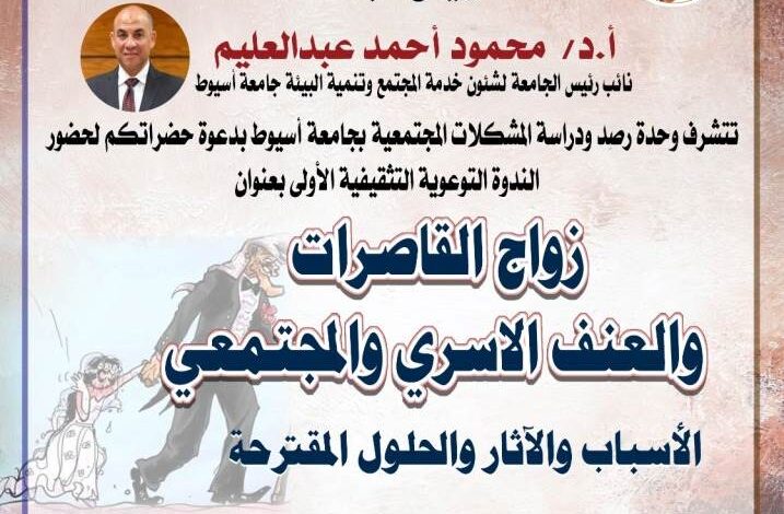 تنظم وحدة رصد ودراسة المشكلات المجتمعية بالجامعة الندوة التوعوية التثقيفية الأولى بعنوان “زواج القاصرات والعنف الأسري والمجتمعي: الأسباب والآثار والحلول المقترحة” تحت رعاية الدكتور أحمد المنشاوي رئيس جامعة أسيوط والدكتور محمود عبد العليم القائم بعمل نائب رئيس جامعة أسيوط لشئون خدمة المجتمع وتنمية البيئة والدكتور حمدي البيطار مدير الوحدةوذلك يوم الأربعاء الموافق 10 من شهر مايو الجاري في تمام الساعة العاشرة والنصف صباحاً بقاعة المناقشات “2” بالمبنى الإداري