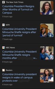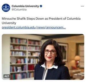 تقدمت نعمت شفيق رئيسة جامعة كولومبيا في الولايات المتحدة باستقالتها ، وذلك بعد أربعة أشهر تقريبا من إشرافها على تعامل الجامعة مع احتجاجات في الحرم الجامعي على خلفية الحرب التي تشنها إسرائيل على غزة.
