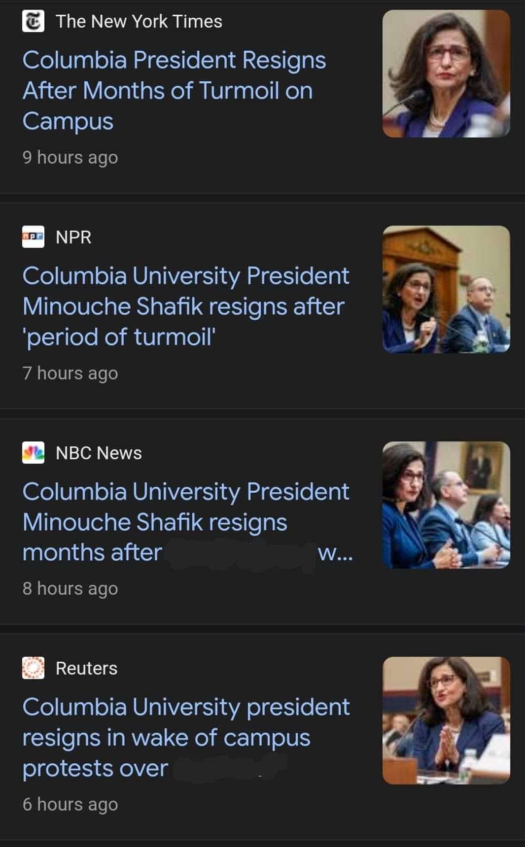 تقدمت نعمت شفيق رئيسة جامعة كولومبيا في الولايات المتحدة باستقالتها ، وذلك بعد أربعة أشهر تقريبا من إشرافها على تعامل الجامعة مع احتجاجات في الحرم الجامعي على خلفية الحرب التي تشنها إسرائيل على غزة.