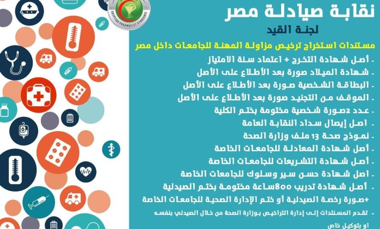 وأوصحت نقابة الصيادلة ان المستندات المطلوبة للقيد بالنقابة لخريجي الجامعات الحكومية والخاصة، وكذلك الجامعات الأجنبية خارج مصر، بالإضافة إلى الأوراق المطلوبة لاستخراج ترخيص مزاولة المهنة كالتالى