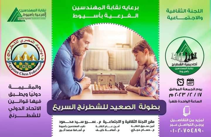عن استضافتها لبطولة الصعيد الدولية للشطرنج السريع والمقيمة دوليًا والمطبق فيها قوانين الاتحاد الدولي للشطرنج، وذلك يوم الجمعة 17 فبراير الجاري