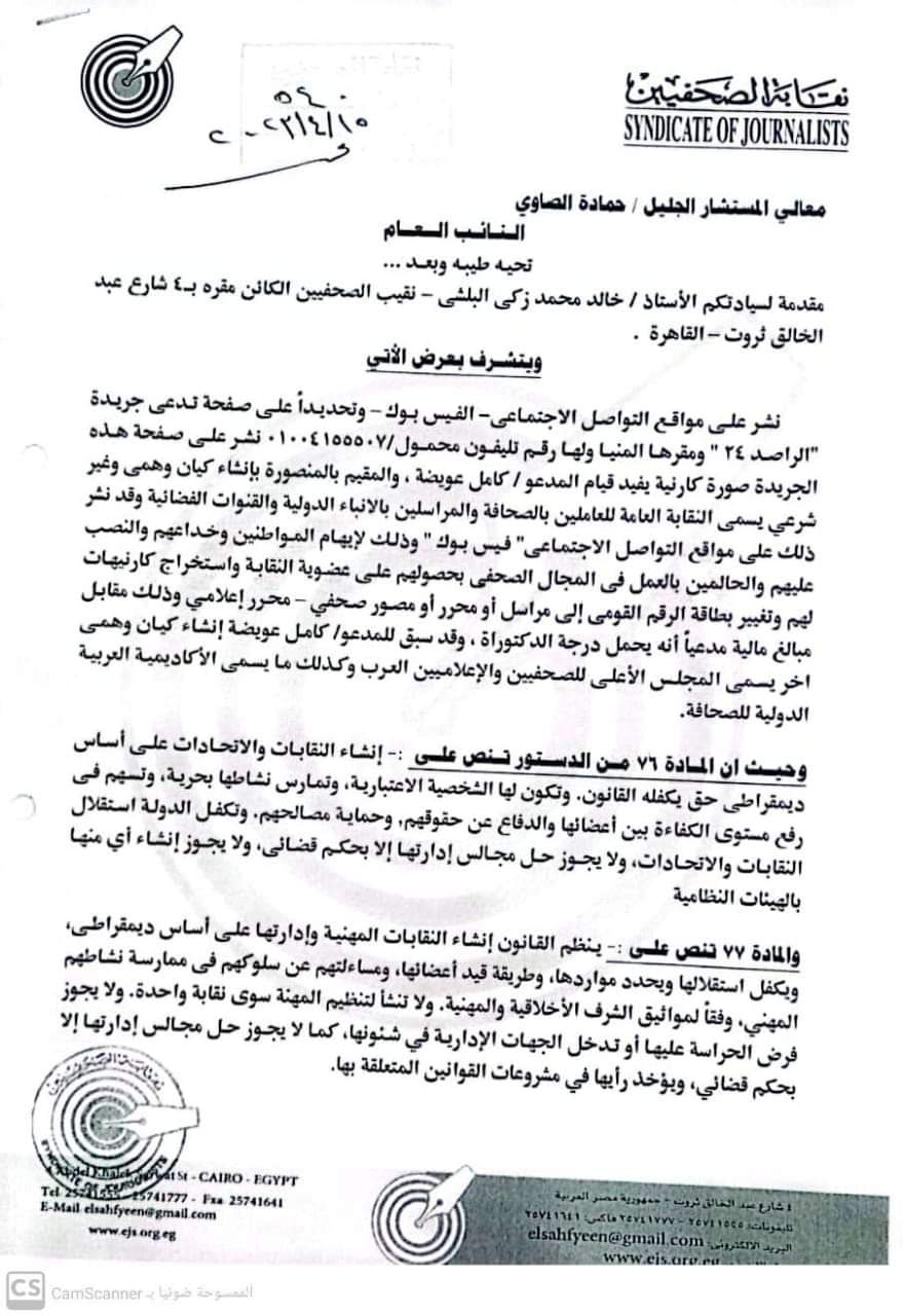 وذكر خالد البلشي نقيب الصحفيين في بلاغه آنه عملا باحكام الدستور والقانون لا توجد في جمهورية مصر العربية سوي نقابة الصحفيين المنشاة بموجب القانون 67 لسنة 1970