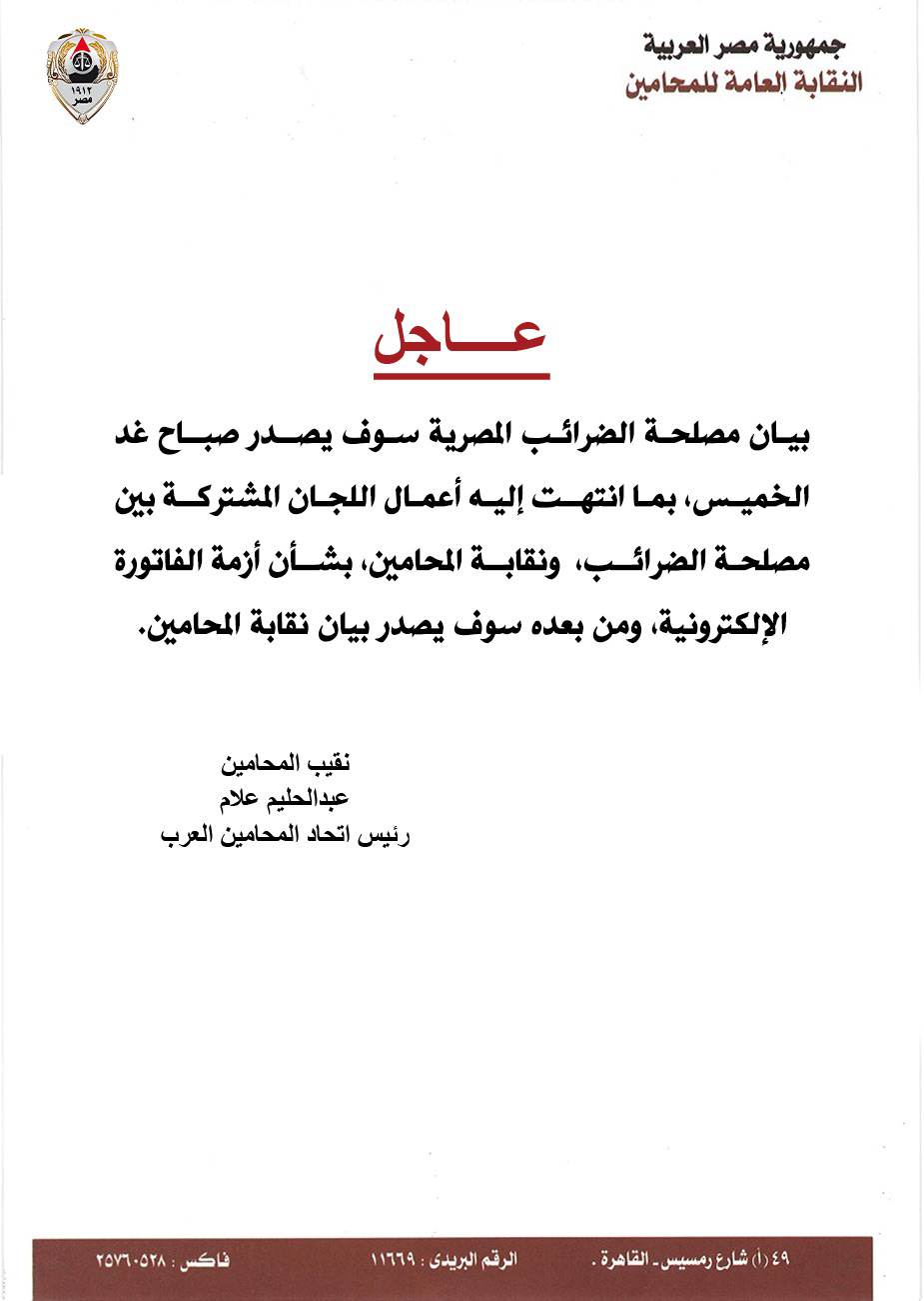 صرح عبدالحليم علام نقيب المحامين رئيس اتحاد المحامين العرب، أن مصلحة الضرائب ستصدر صباح غداً الخميس، بياناً لعرض نتائج ما انتهت إليه أعمال اللجان المشتركة بين المصلحة، ونقابة المحامين، بشأن أزمة الفاتورة الإلكترونية.