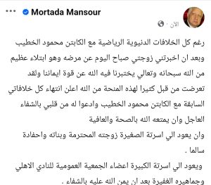 “رغم كل الخلافات الدنيوية الرياضية مع الكابتن محمود الخطيب وبعد ان اخبرتني زوجتي صباح اليوم عن مرضه وهو ابتلاء عظيم من الله سبحانه وتعالي يختبرنا فيه الله عن قوة ايماننا ولقد تعرضت من قبل كثيرا لهذه المنحة من الله اعلن انتهاء كل خلافاتي السابقة مع الكابتن محمود الخطيب وادعوا له من قلبي بالشفاء العاجل وان يمتعه الله بالصحة والعافية