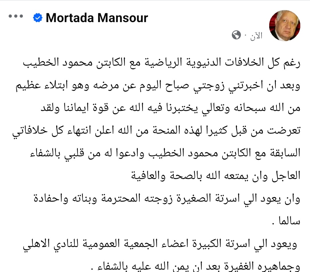 “رغم كل الخلافات الدنيوية الرياضية مع الكابتن محمود الخطيب وبعد ان اخبرتني زوجتي صباح اليوم عن مرضه وهو ابتلاء عظيم من الله سبحانه وتعالي يختبرنا فيه الله عن قوة ايماننا ولقد تعرضت من قبل كثيرا لهذه المنحة من الله اعلن انتهاء كل خلافاتي السابقة مع الكابتن محمود الخطيب وادعوا له من قلبي بالشفاء العاجل وان يمتعه الله بالصحة والعافية