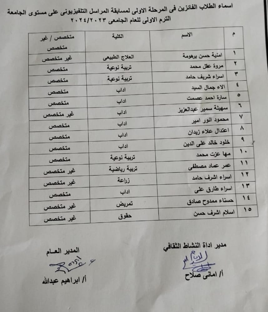 نوعية بنها تحصد المراكز الأولى بمسابقة المراسل التليفزيونى على مستوى الجامعة