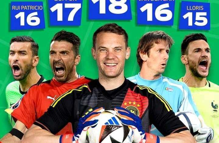 نوير البالغ 38 عاما شارك في 17 مباراة سابقة باليورو استقبل 17 هدفا وحافظ على نظافة شباكه في 6 خلال 1560 دقيقة.
