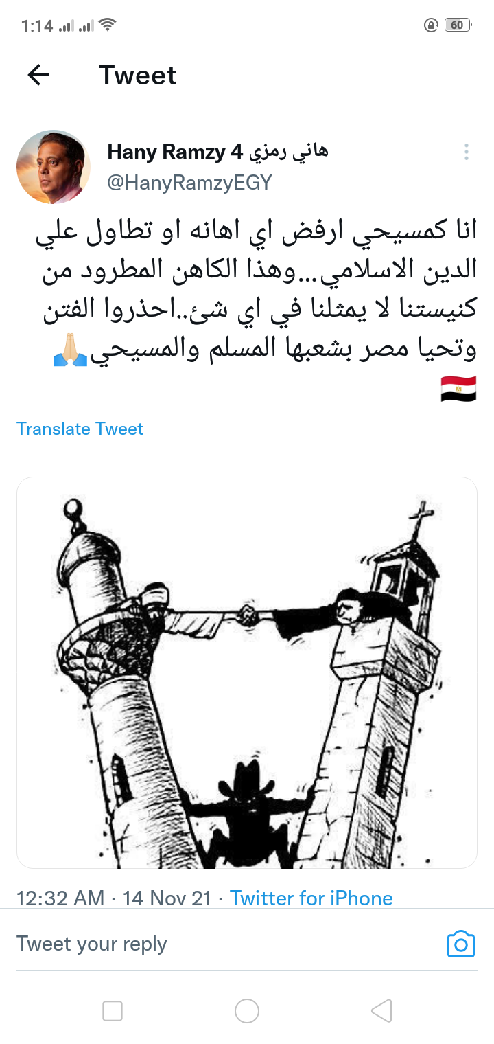“انا كمسيحي ارفض اي اهانه او تطاول علي الدين الاسلامي…وهذا الكاهن المطرود من كنيستنا لا يمثلنا في اي شئ..احذروا الفتن وتحيا مصر بشعبها المسلم والمسيحي”