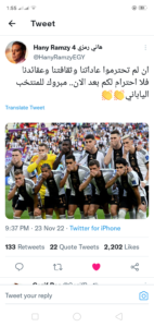 غرد هاني رمزي نجم النادي الأهلي السابق ومنتخب مصر بعد انتهاء مباراة ألمانيا واليابان في بطولة كأس العالم لكرة القدم المقامة في قطر والتي انتهت بفوز المنتخب الياباني بهدفين دون رد قائلا: