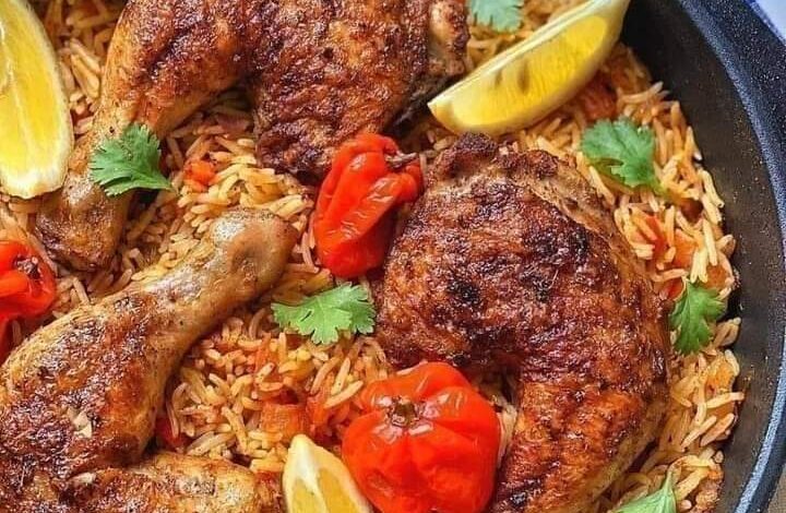 6- يقدم الارز في طبق التقديم ثم يوضع فوقه الدجاج و ممكن ان يزين بالمكسرات