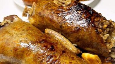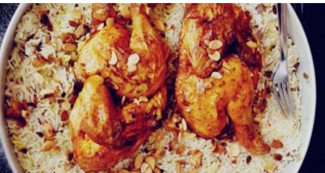 ويقدم في طبق ويضاف عليه الفراخ من فوقه ونقوم بتزيينه بالمكسرات والزبيب .