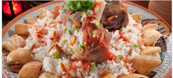 رُصّي الخبز في الصينية، واسقيه بالمرق وضعي بعد ذلك الأرز و اللحمة، ثمّ اسقي الطبقات بالصلصة.