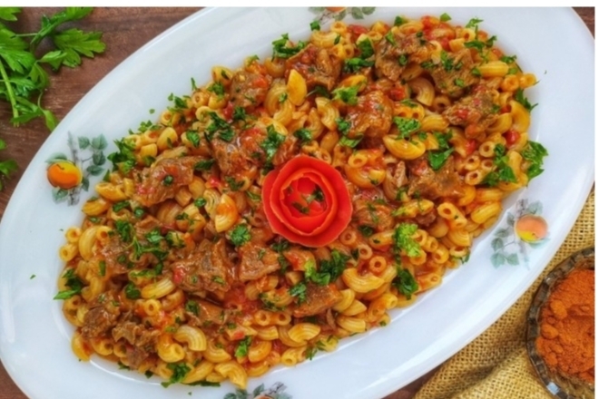 اكلتنا النهارده هتعحبكم جدآ لسهولة طبخها وطعمها اللذيذ وفايدتها الغذائية الكبيرة وهي مكرونةبمكعبات اللحم والصلصة
