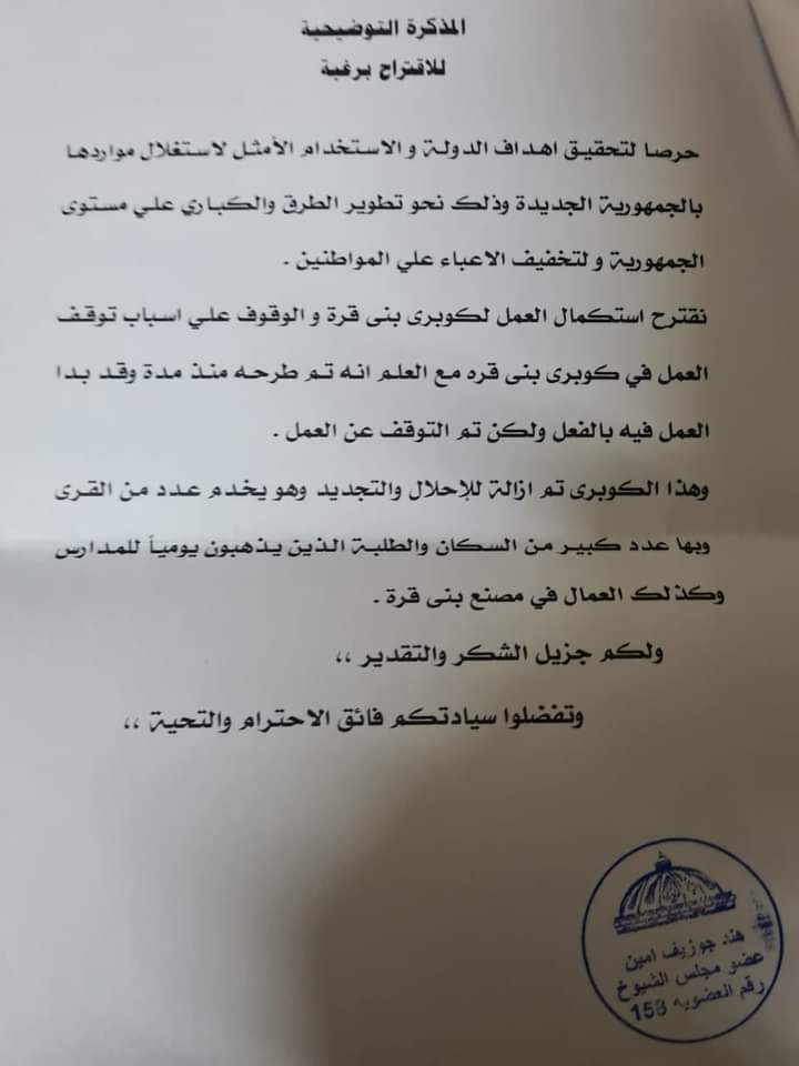 انه تم طرح الكوبرى منذ مده وقد تم بدأ العمل فية بالفعل لكن تم التوقف عن العمل.