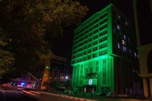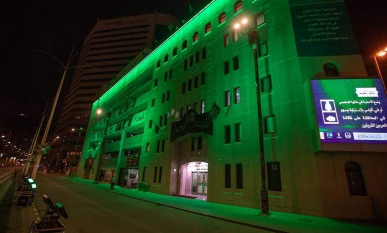 واجهة مبنى رئاسة الحرمين ومكتبة الحرم المكي تتوشح بالأخضر احتفاءً باليوم الوطني ال٩٠..