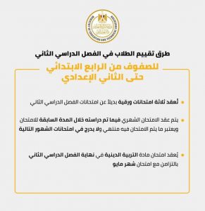 تُعقد ثلاثة اختبارات ورقية مجمعة في شهر مارس وابريل ومايو بنفس الضوابط الخاصة بامتحانات صفوف النقل للصفوف من الرابع الابتدائي حتى الثاني الإعدادي بديلاً عن امتحانات الفصل الدراسي الثاني.