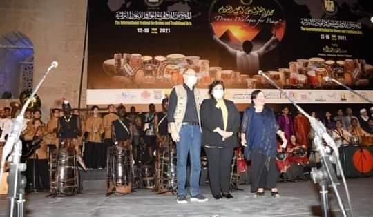 وقدم الفنان انتصار عبد الفتاح رئيس ومؤسس المهرجان الشكر لوزيرة الثقافة لحماسها المستمر لاستئناف الانشطة الابداعية بجميع المواقع الثقافية ودعمها اقامة المهرجان واضاف بان المهرجان يعد تحفة فنية وحضارية متميزة هذا العام ونموذج للتحدي والصمود تحت شعار حوار الطبول من اجل السلام واشار الى ان المهرجان يعد سوقا ومنتجا سياحيا وثقافيا متميزا يخلق حالة من التواصل بينها الشعوب ويعبر الازمنة والامكنة .